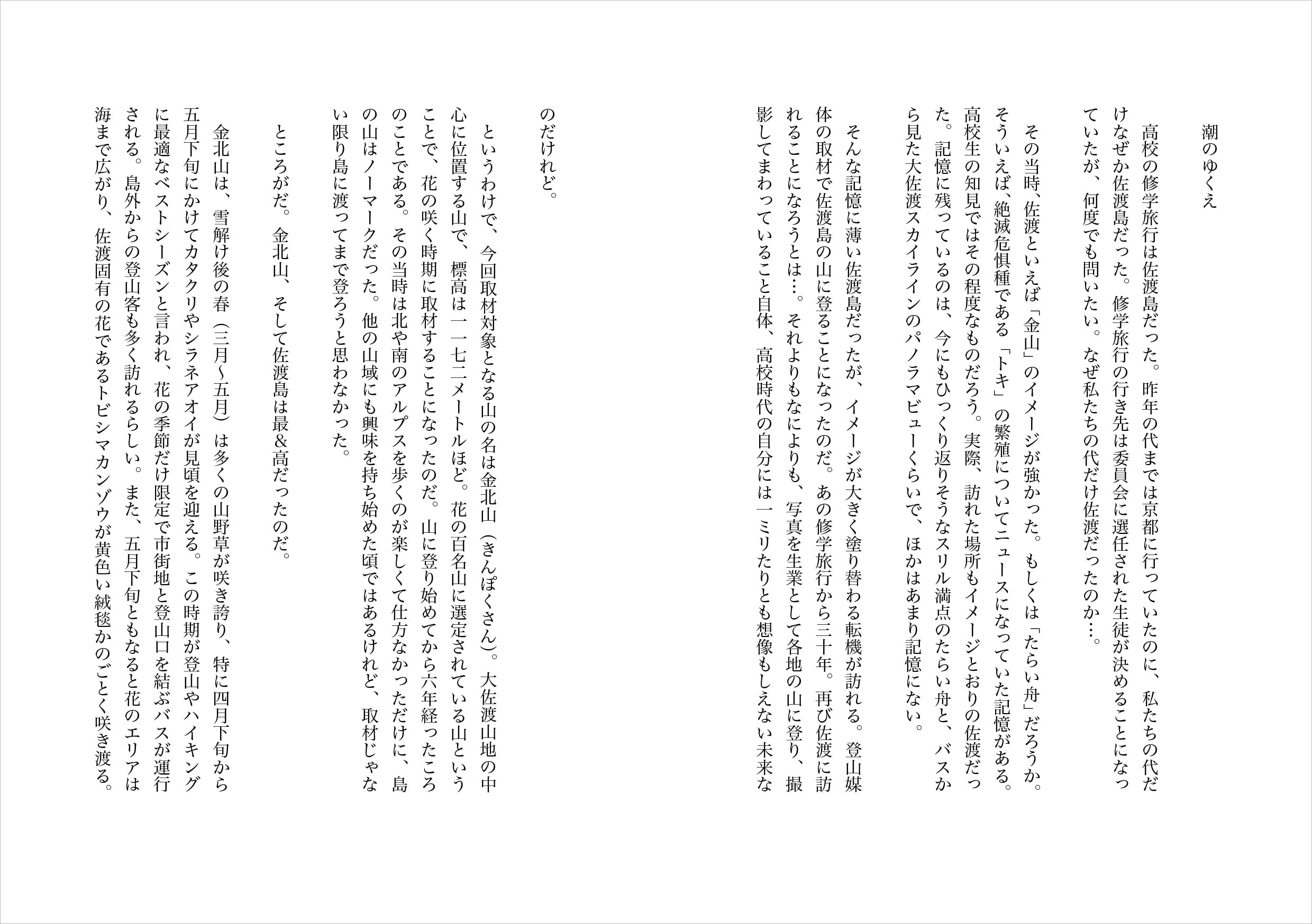 花の百名山として名高い金北山(きんぽくさん)がそびえる佐渡島は、雪解けを迎えると色とりどりの花が咲き乱れます。高校の修学旅行で訪れたときには見いだせなかった佐渡の魅力。佐渡の本当の美しさは山にあるのだと気付かされます。